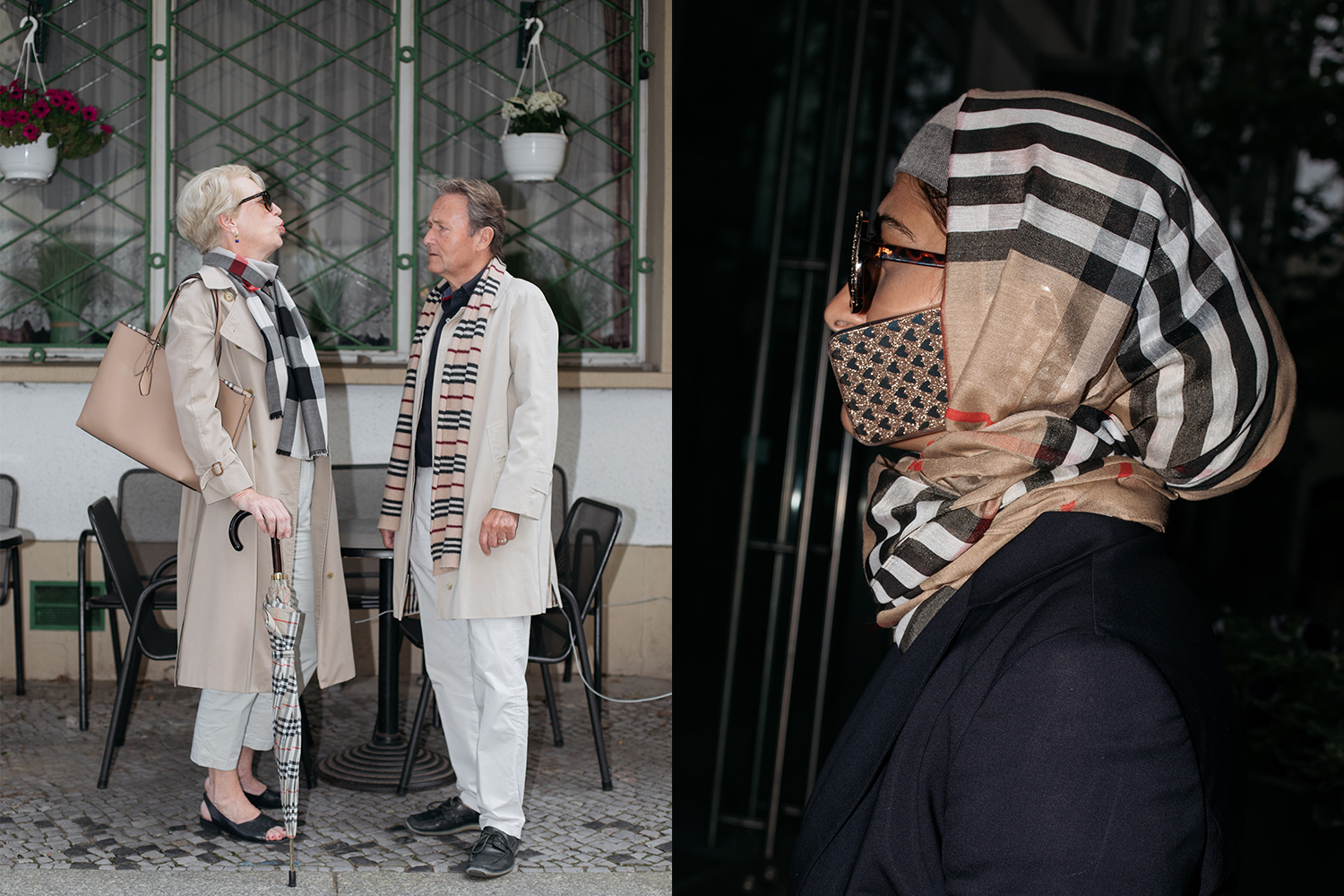 - Burberry scarf around head