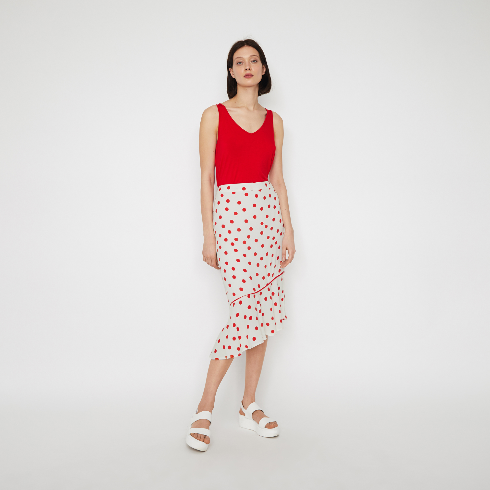 - Shopping White spot ruffle midi skirt