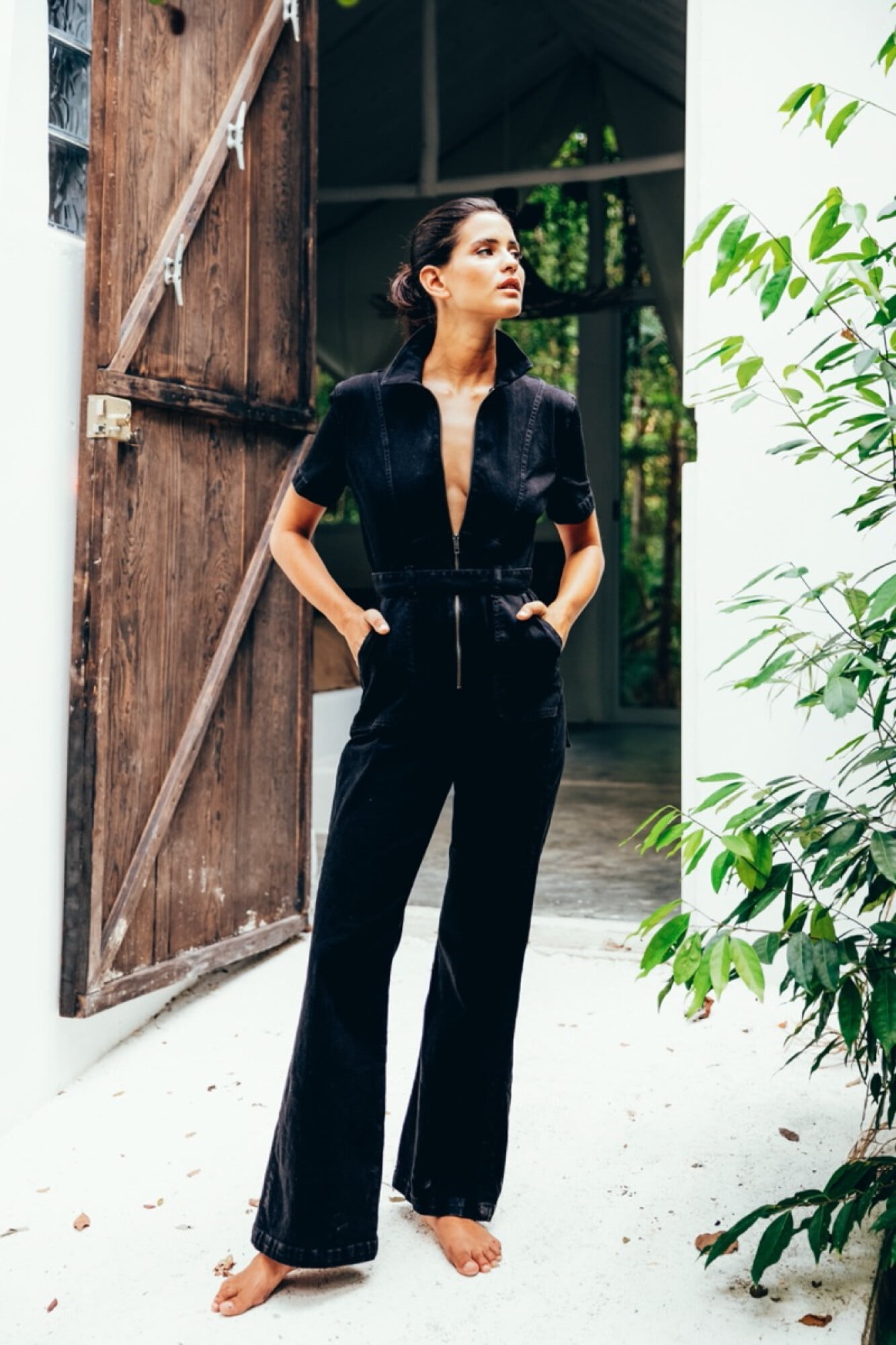 - Black denim jumpsuit shorts