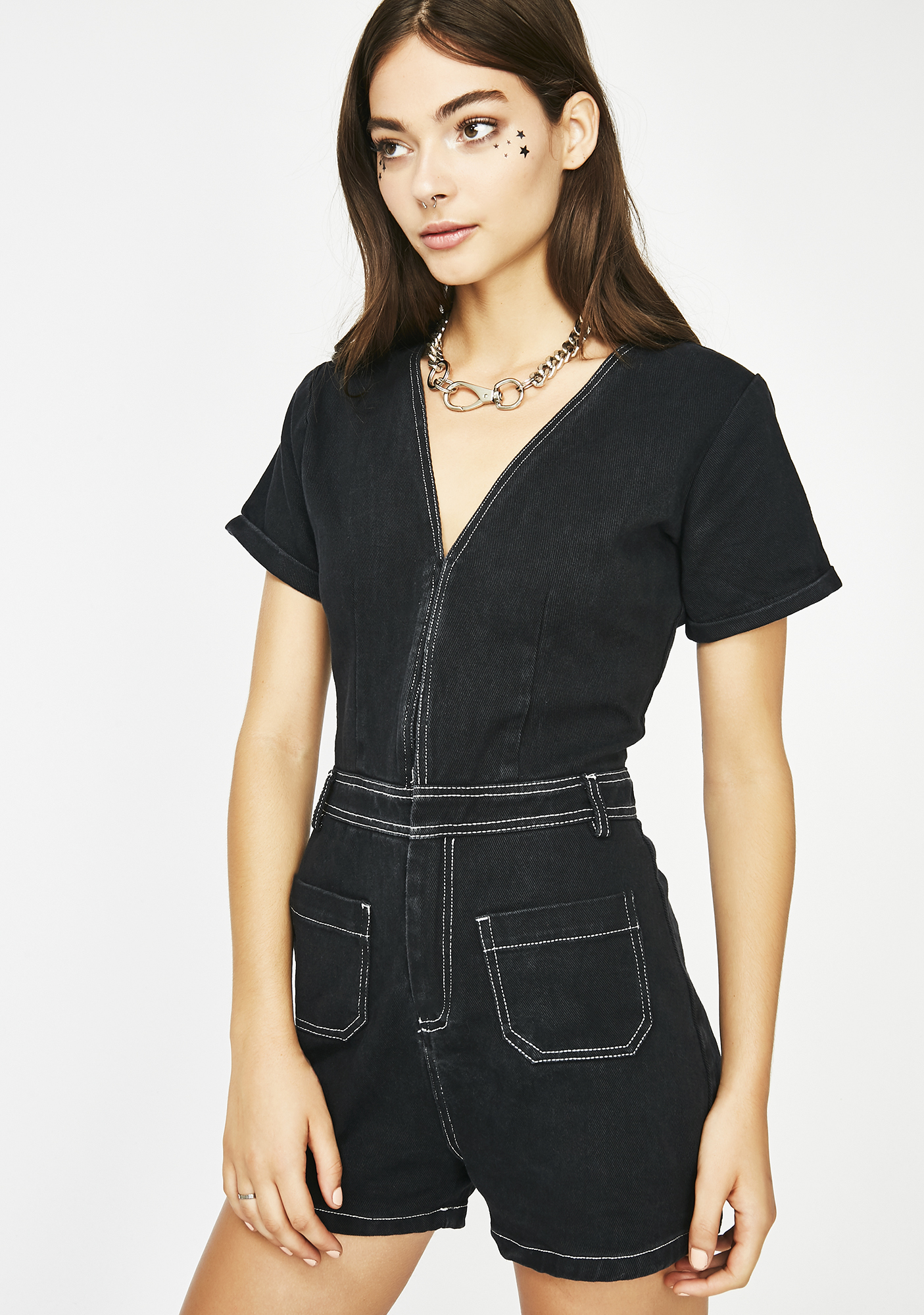 Black denim jumpsuit shorts Clearance, Denim Short Sleeve Romper | Dolls Kill Clearance