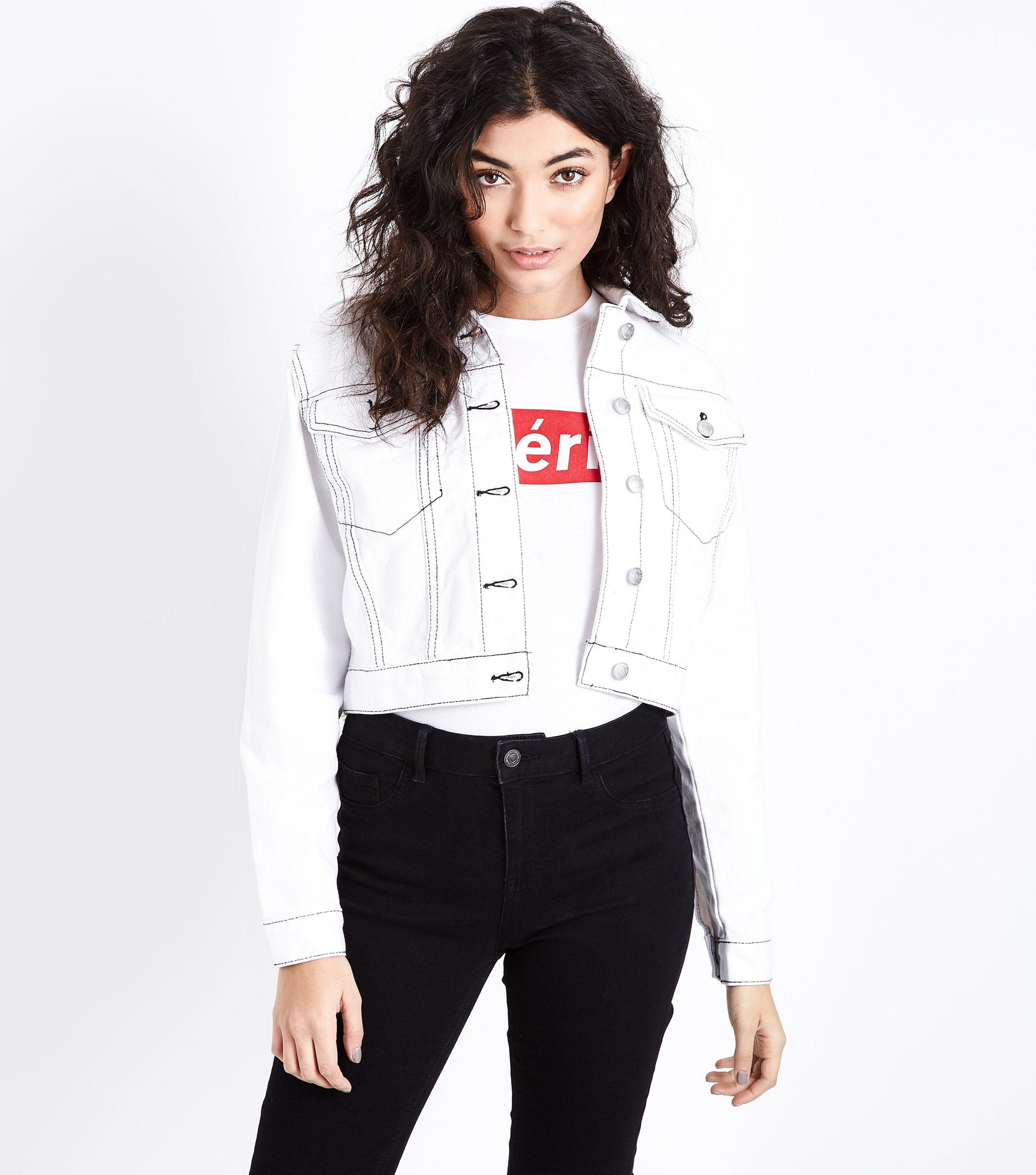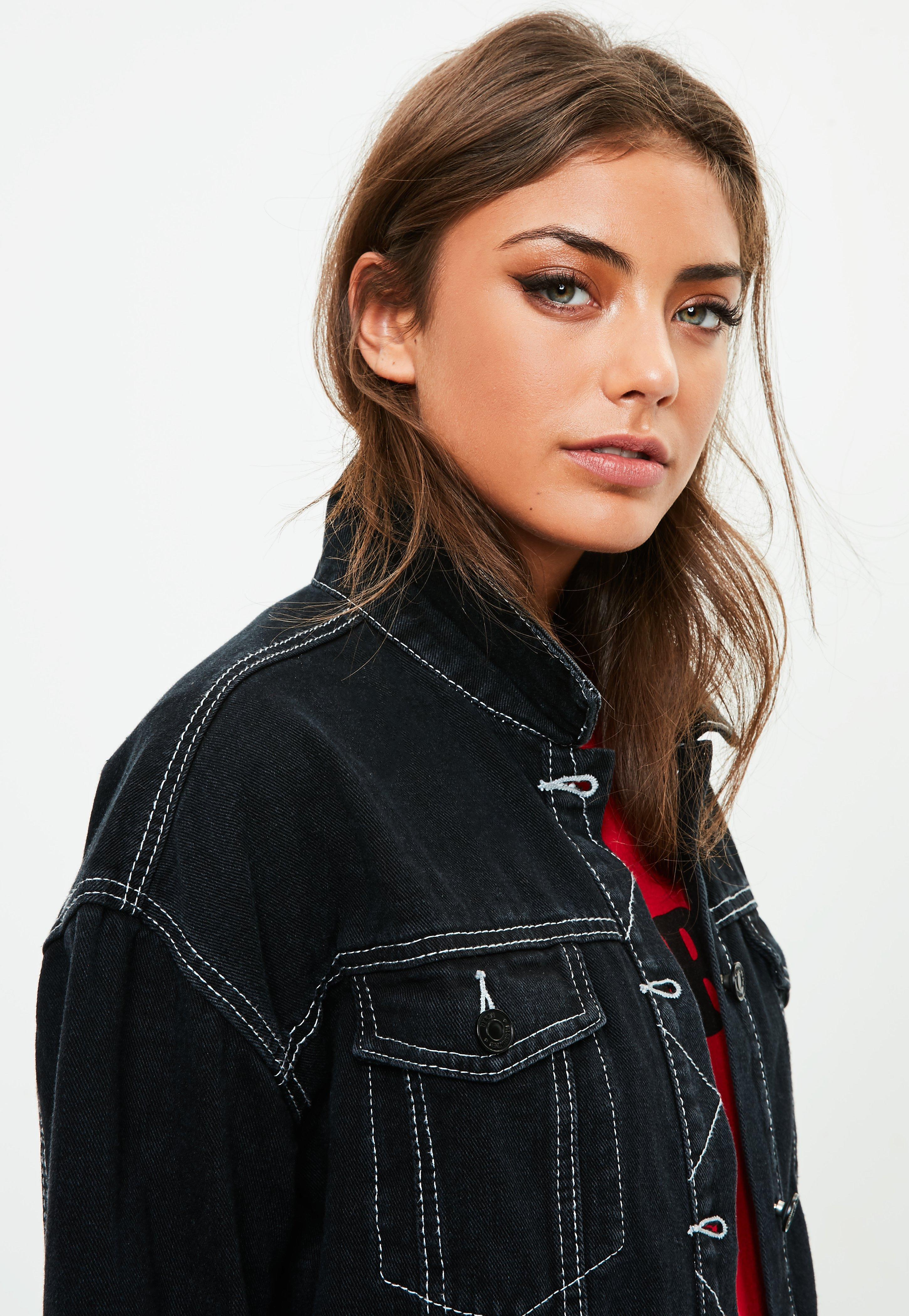 - Shopping Black cropped denim jacket with white stitching