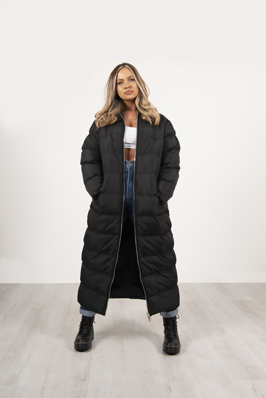 - Black maxi longline puffer jacket