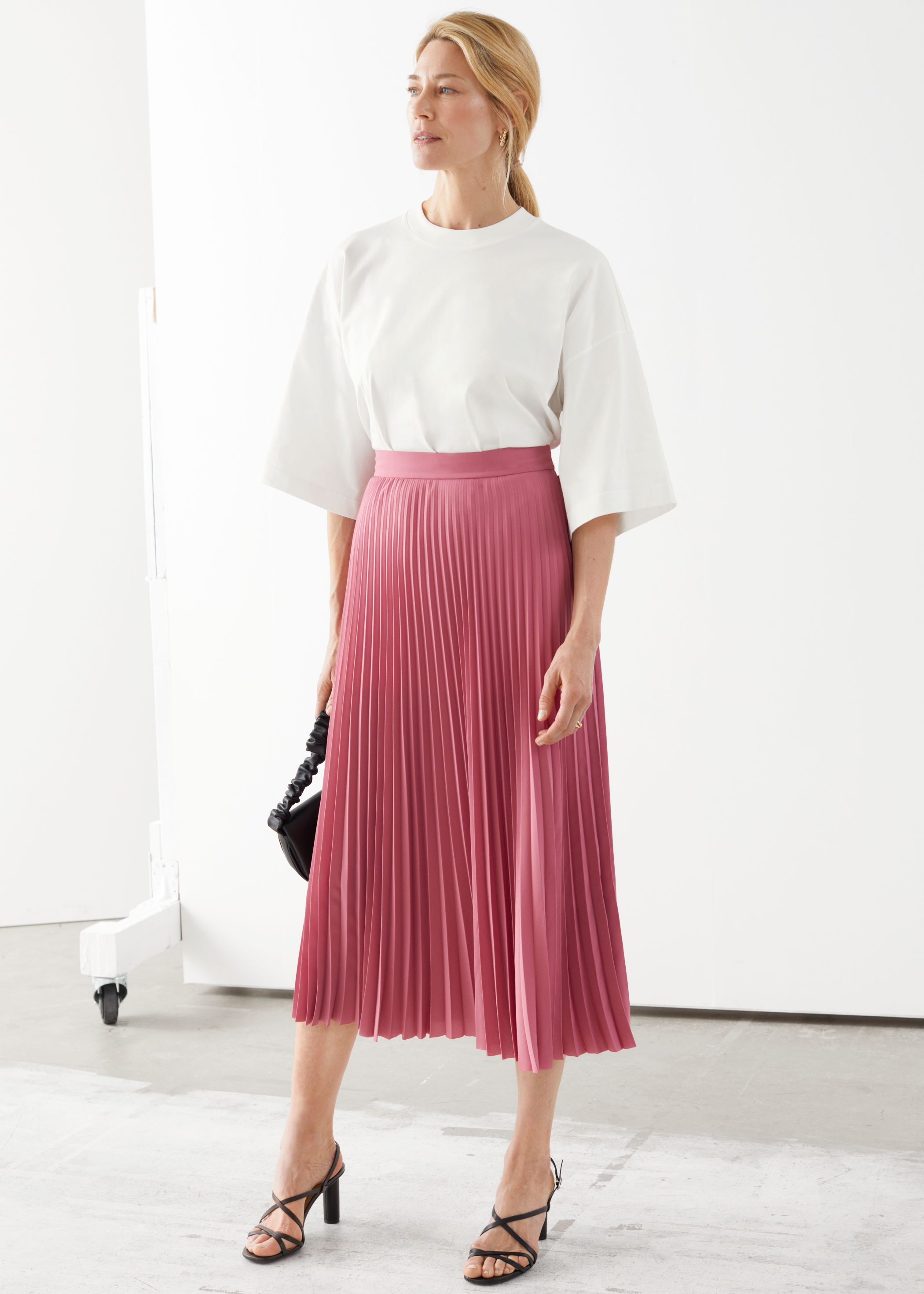 - Pink pleated midi skirt
