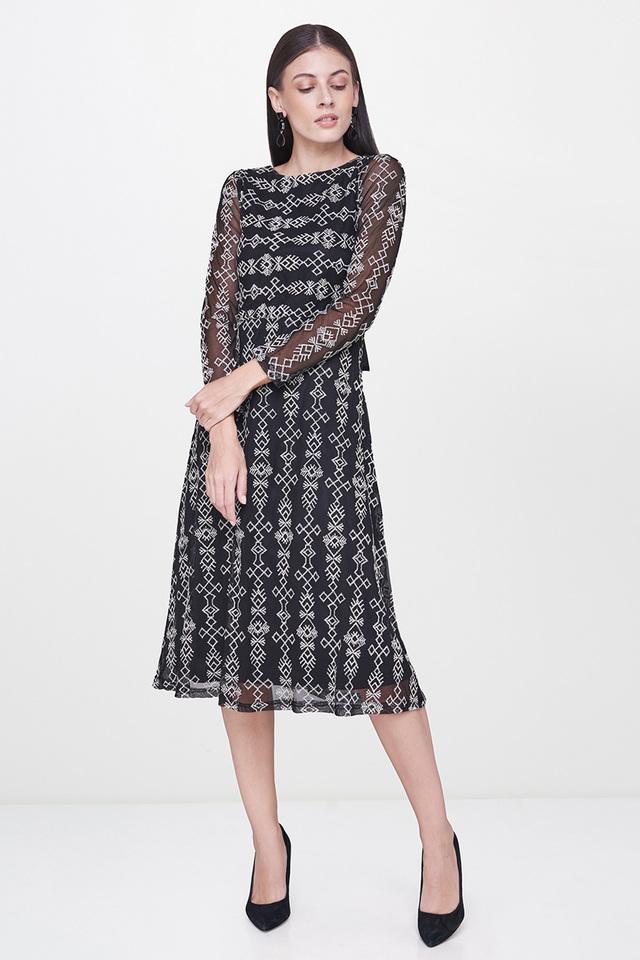 Knee length midi dress Clearance, Black Multicolored Printed Poly Crepe Clearance