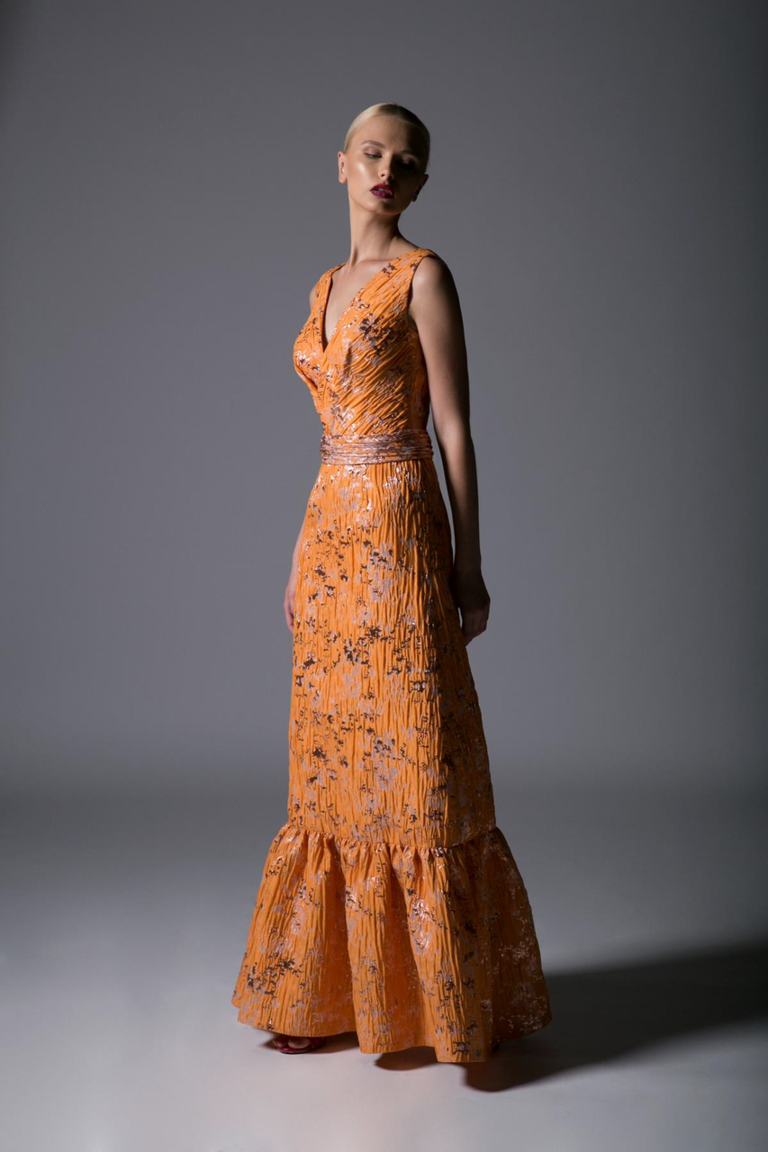 Jacquard evening gown Clearance, Orange Sleeveless Jacquard A-Line Clearance