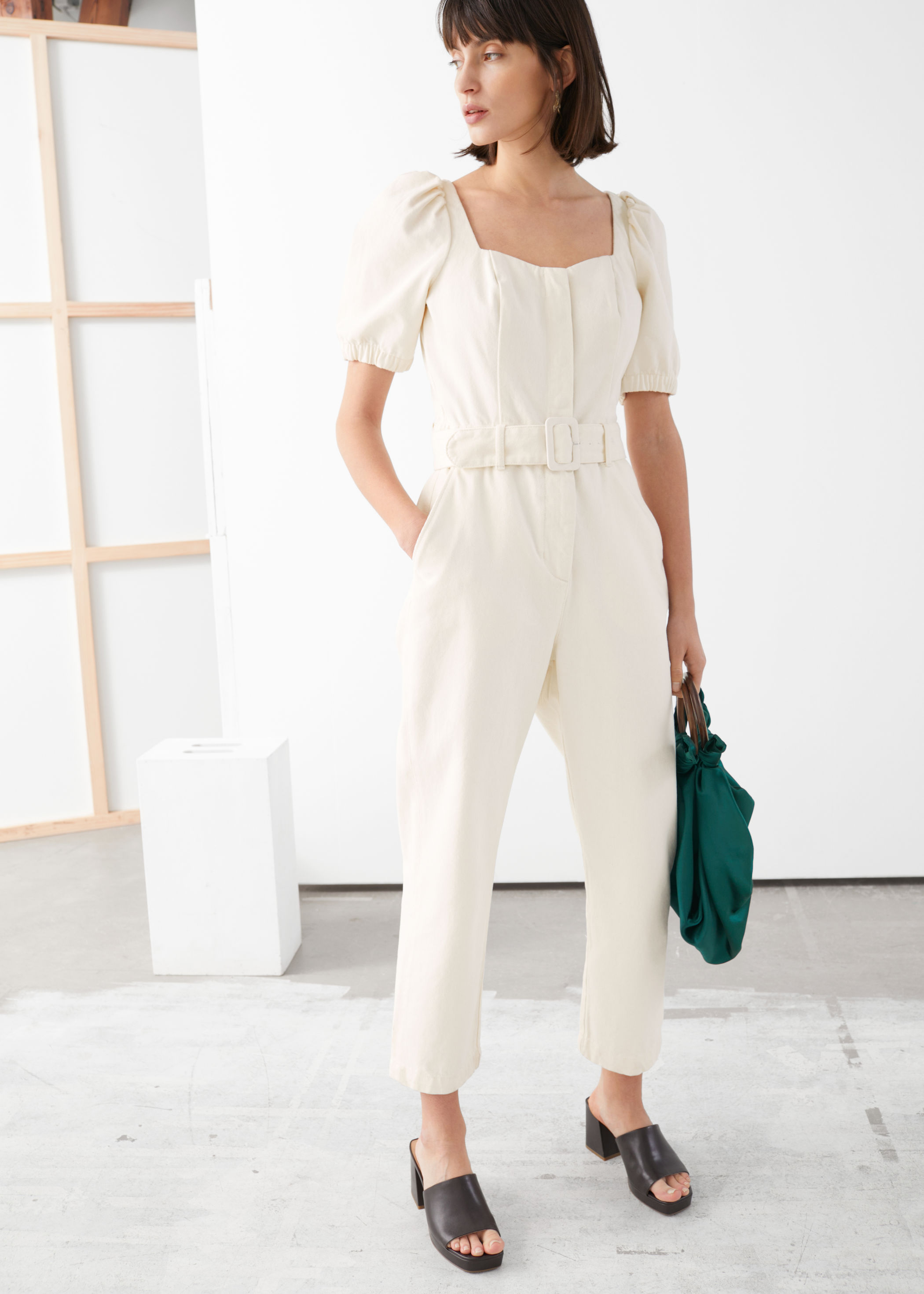 - Belted jumpsuit with puff shoulders