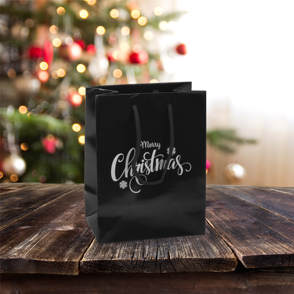 Black christmas sack Clearance, Gloss Black Merry Christmas Carrier Bags from stock at MIDPAC. Boutique paper carrier bags with a silver Merry Christmas design printed to 1 side of the bag. Clearance