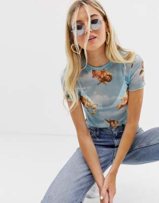 - Bershka angel print t shirt in blue sale