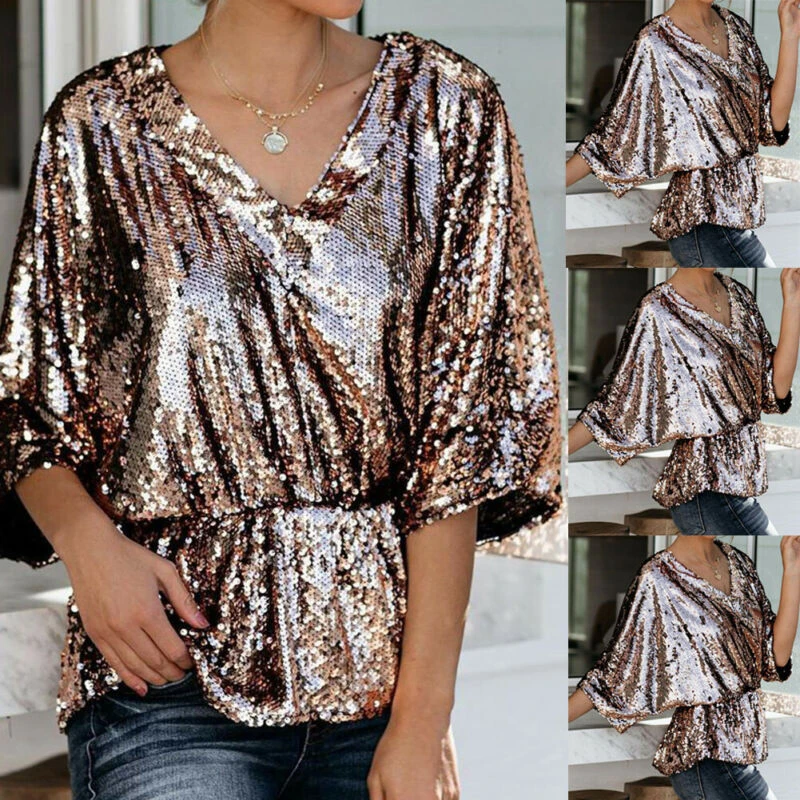 Ladies glitter blouses Clearance, 2020 Ladies Women V Neck Shine Glitter Clearance