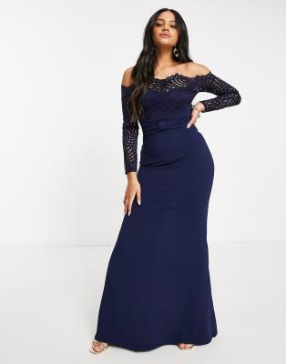 - Bridesmaid navy bardot lace insert fishtail maxi dress clearance
