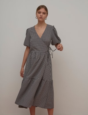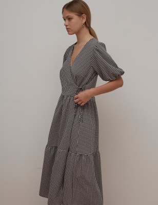 Midaxi wrap dress Clearance, Checked Puff Sleeve Midaxi Wrap Dress Clearance