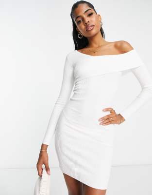 Creme kleid Clearance, Miss Selfridge – Asymmetrisches Rippstrick-Kleid in Creme mit Carmenausschnitt | ASOS Clearance